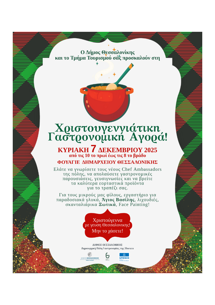 Σε μία κίνηση που συνδυάζει την εορταστική ατμόσφαιρα με τη στρατηγική ενίσχυση της τοπικής αγοράς, ο Δήμος Θεσσαλονίκης και το τμήμα Τουρισμού, διοργανώνει τη “Χριστουγεννιάτικη Γαστρονομική Αγορά”, στις 7 Δεκεμβρίου από τις 10.00 το πρωί έως τις 20.00, στο φουαγιέ του Δημαρχείου.